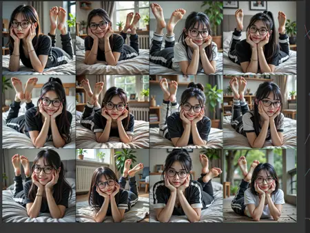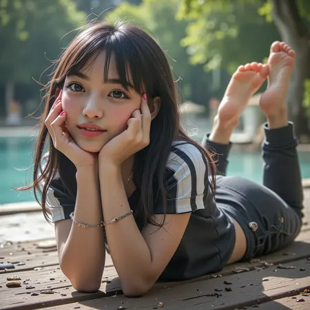 高景深、24K UHD原始照片:一位可爱的年轻亚裔女性。她俯卧着,双手支撑头部,双脚俏皮地抬起悬在空中。 她穿着黑白运动裤和配套的低领T恤。