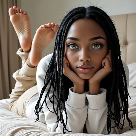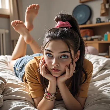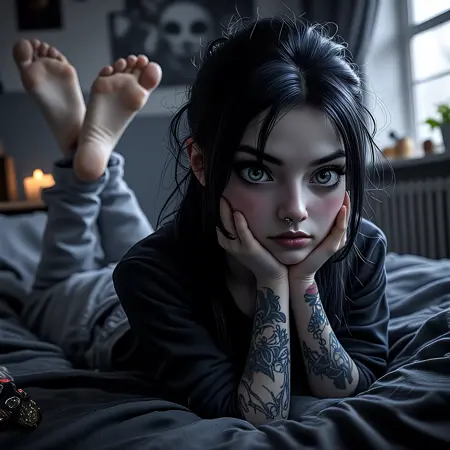一张生动的原始照片,描绘一位半写实、完美无瑕的哥特女孩。她拥有少女般的面部特征。她俯卧在床上,双腿在身后交叉,双脚悬空抬起。 她的卧室拥有电影级灯光,墙壁上布满哥特风格装饰。她穿着灰色运动裤和黑色上衣,双臂有复杂的哥特风格纹身。她以不耐烦的表情直视观者。她肤色苍白,拥有浓密而富有层次感的长发,发根为黑色,发梢为白色,发型凌乱蓬松。她的眼睛大而杏仁形,用浓重的黑色眼线和睫毛膏勾勒,呈现出强烈而神秘的眼神。左鼻孔有一枚小巧银质鼻环,下唇有一枚小型唇钉。整体兼具女性化与威慑力的特征。
