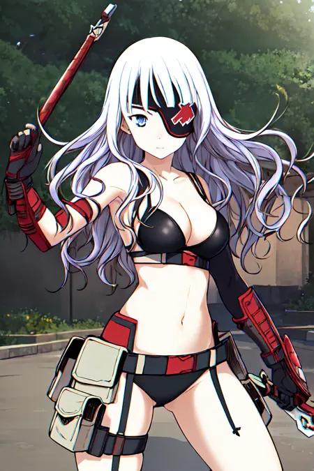 1girl, solo, long hair, medium breasts, thighhighs, navel, cleavage, white hair, eyepatch, single thighhigh, holster,