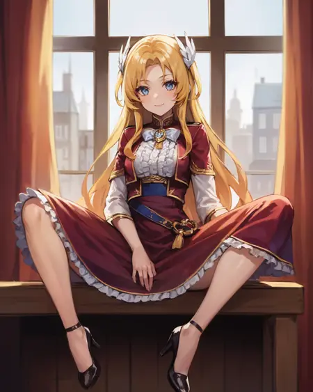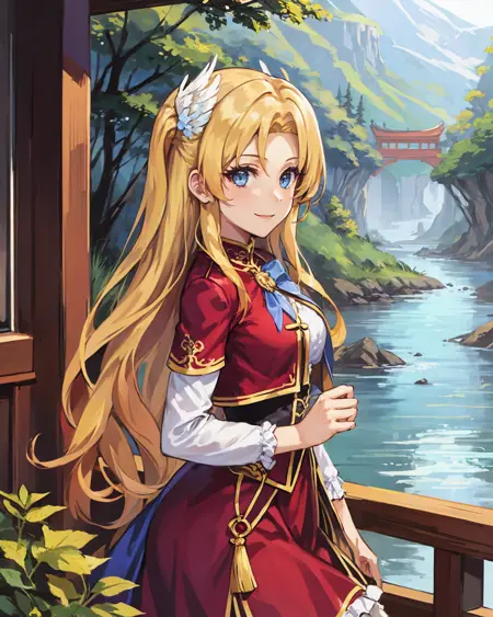 <lora:Alfin-07:0.8>, Alfin Reise Arnor, 金髪, 青い目, 小さな胸, 髪飾り, 翼の装飾,