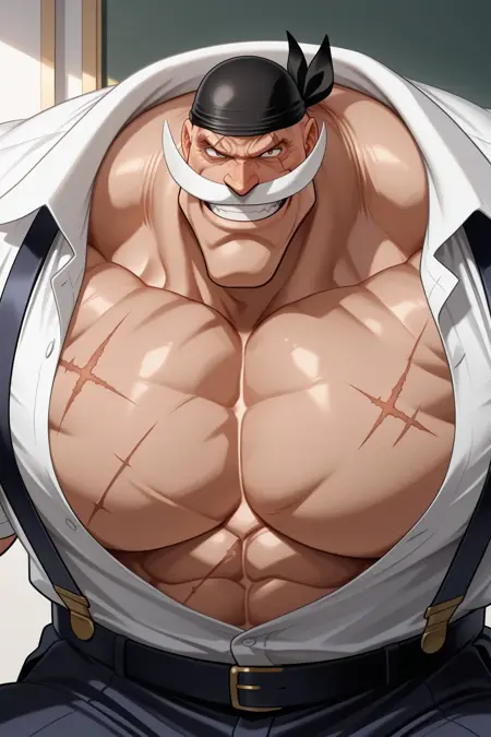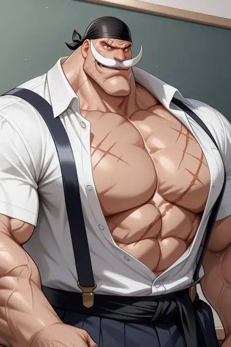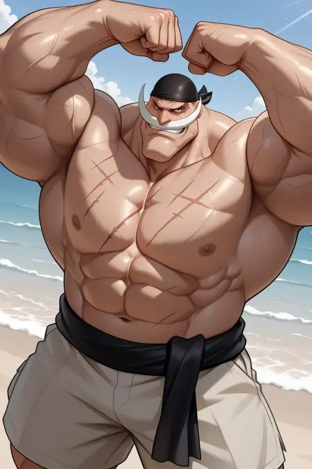 より良い結果を得るために、次のプロンプトをご使用ください:"(shirohige, black bandana, shirohige mustache, shirohige eyes, beardless:1.3, scar on chest)"、"negative: (beard, bearded):1.5, jacket on shoulder"