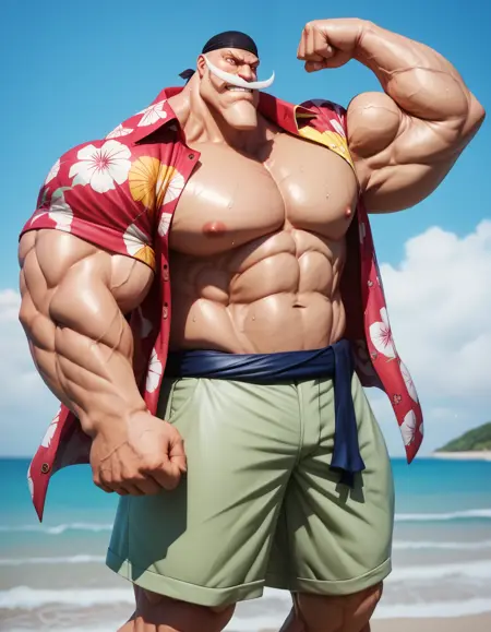더 나은 결과를 얻으려면 다음 프롬프트를 사용하세요: "(shirohige, 검은 머리띠, shirohige 콧수염, shirohige 눈, 수염 없음:1.3, 가슴에 흉터)", "부정: (수염, 수염 난):1.5, 어깨에 재킷"