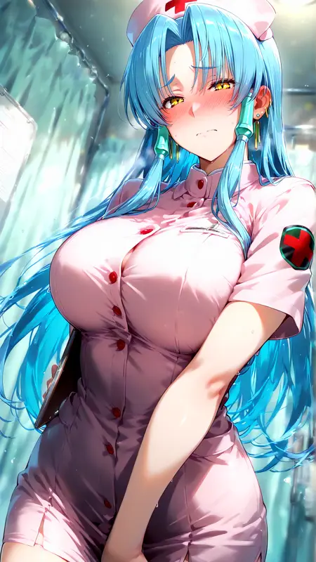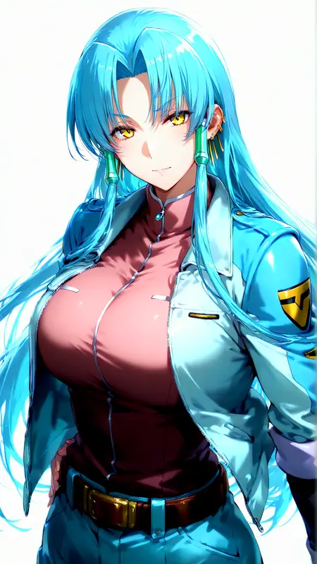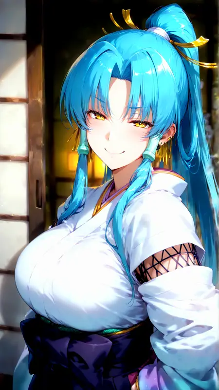 외모: 포니테일, 머리 관, 파란 머리, 노란 눈, 큰 가슴