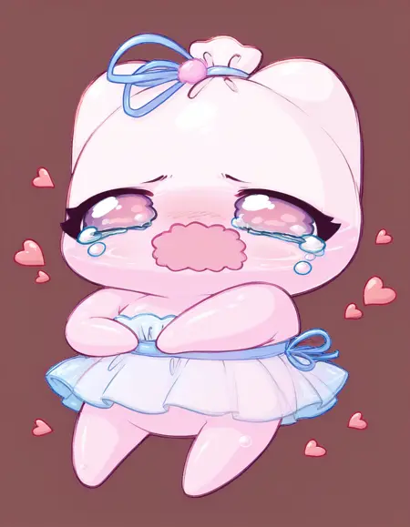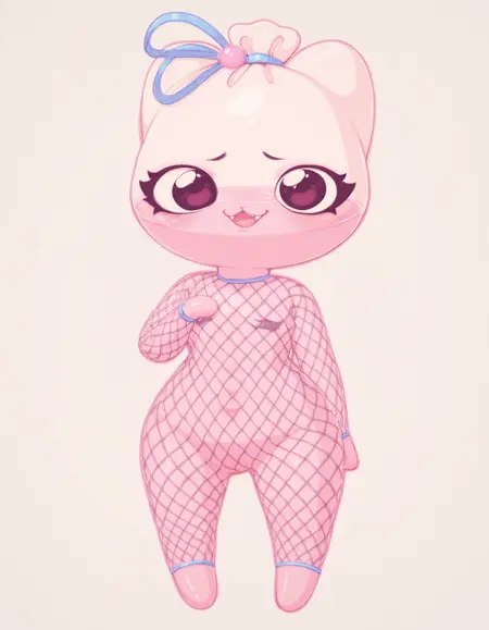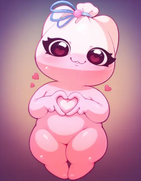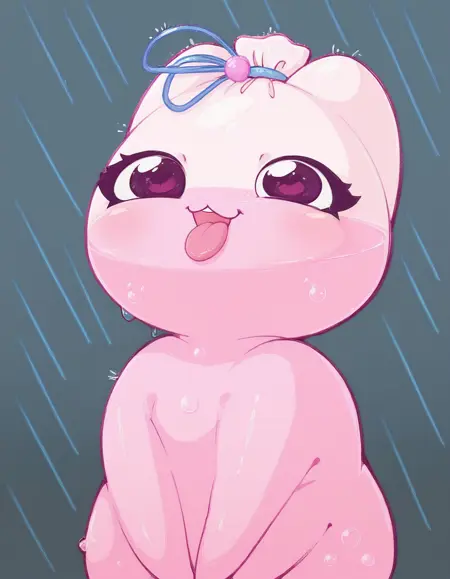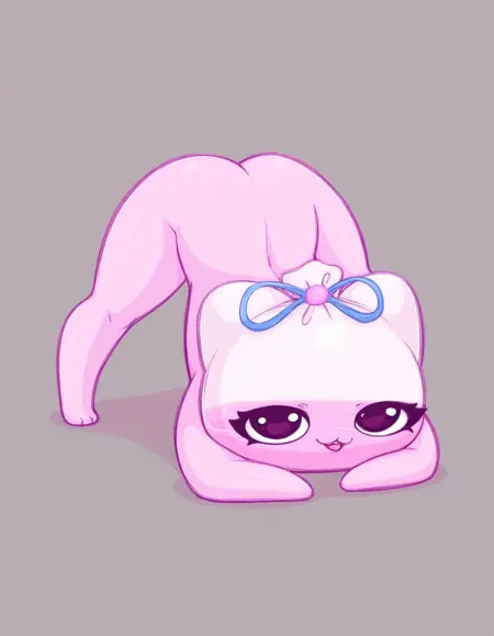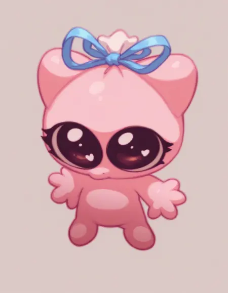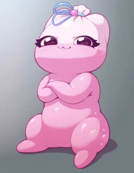 Promt: creature, Kiselka, pink jelly body, semi-transparent body, blue ribbon tied on top.