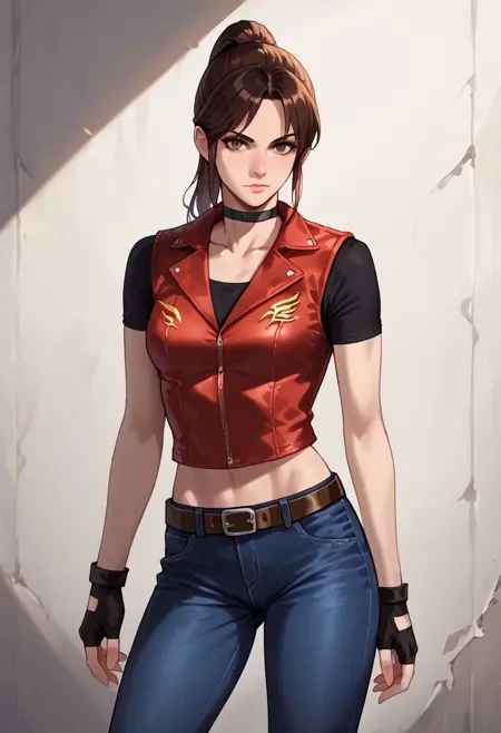 claireveronica, brown hair, ponytail, choker, black shirt, leather vest, midriff, belt, jeans, fingerless gloves,