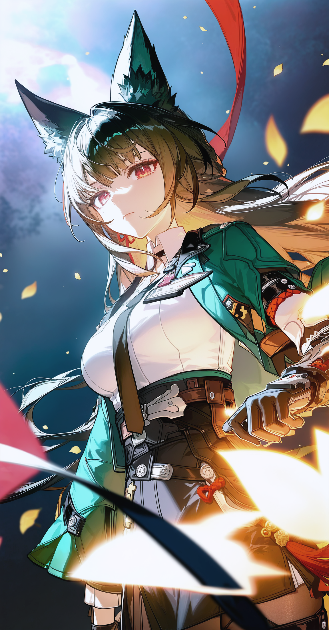 - green cape, black necktie, sheath, black pantyhose, white shirt, robotic arm, high-waist skirt