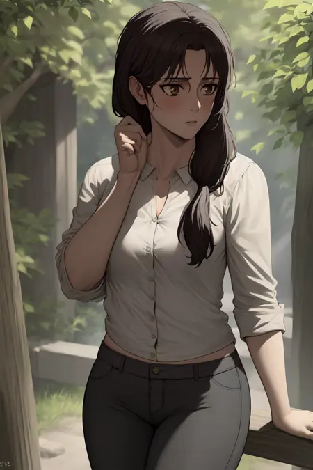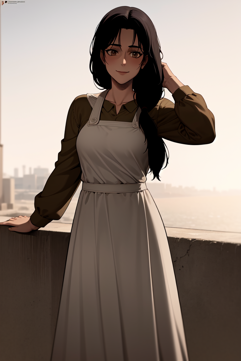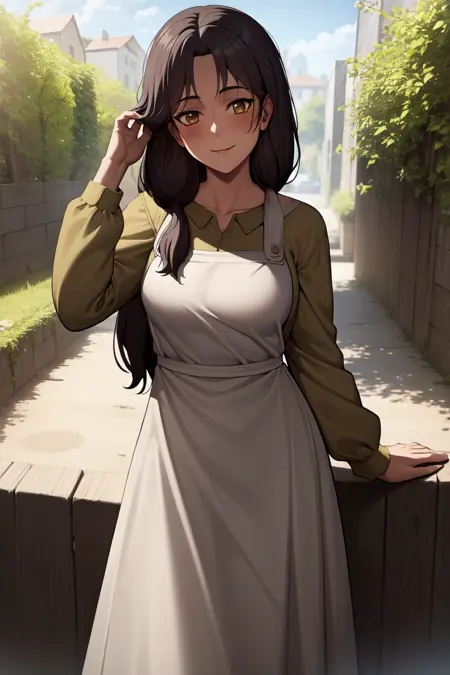 "Carla Yeager, long hair, hair over shoulder, apron, long skirt"