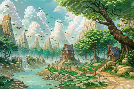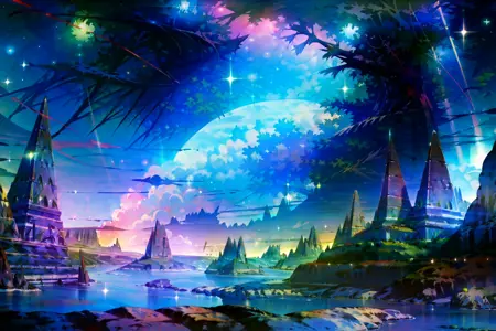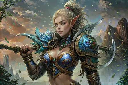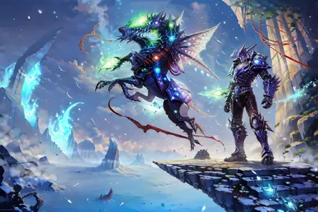 darkness,weapon,star(sky),glowing,android,robot,fantasy,landscape, waterfall, tree, knight, helmet, cloudy sky, outdoors, male focus, snowing,mountain, floating island, cloud, scenery, sky, day, 1girl, no humans, fire,nature, sword, castle, armor, cape, forest, lantern, grass, water, light rays, flower, sunlight, bridge, fantasy, house,villages, rivers, buildings 등 월드 오브 워크래프트 스타일과 관련된 프롬프트들을 활용해보세요.