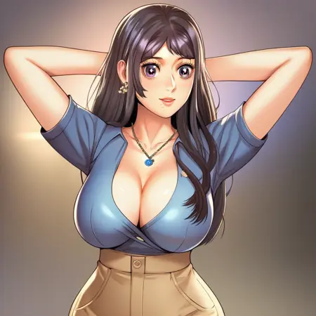 5. ((性感美丽的短袖蓝衬衫,巨大胸脯,露骨胸脯,带有蓝色吊坠的美丽金项链,米色长裤)) + 白色高跟鞋,黑色铅笔裙,性感黑色蕾丝吊袜带,性感透明黑色蕾丝长筒袜,美丽奢华耳环,性感透明黑色蕾丝文胸