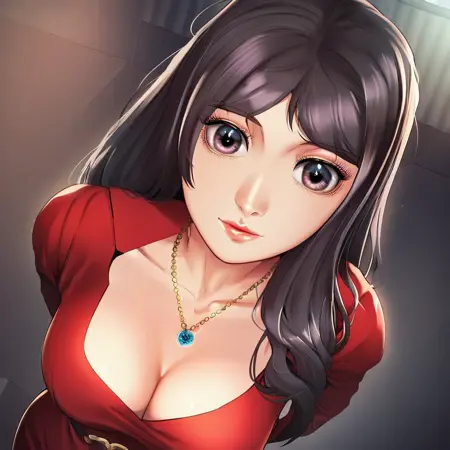 1. ((性感美丽的长袖红裙,巨大胸脯,露骨胸脯,带有蓝色吊坠的美丽金项链)) + 黑色高跟鞋,金色链条黑色手提包,美丽奢华耳环