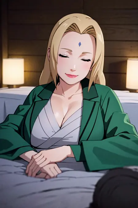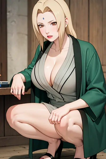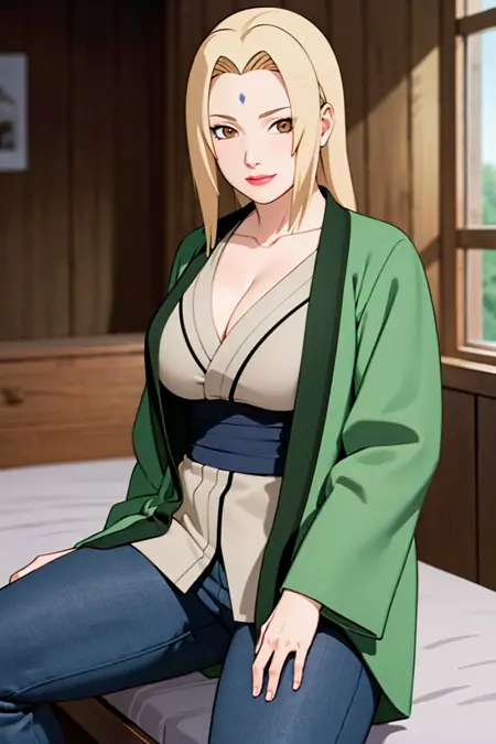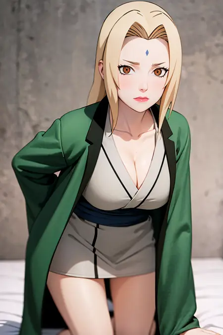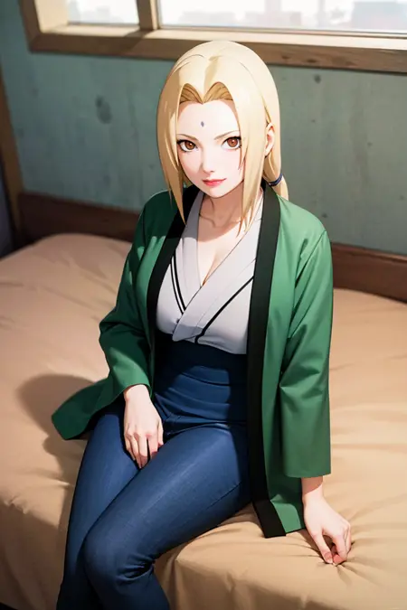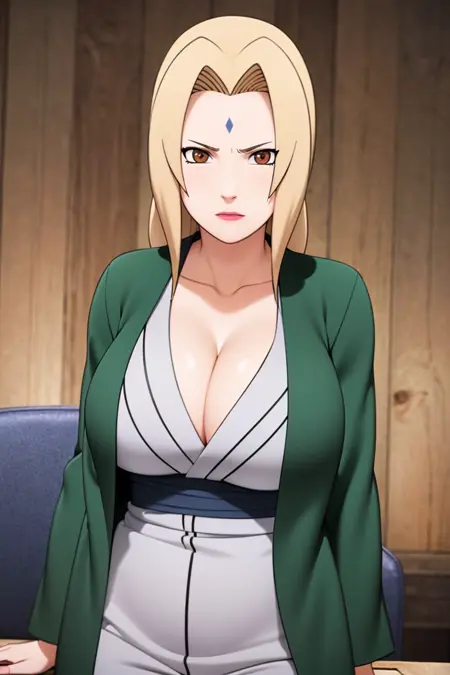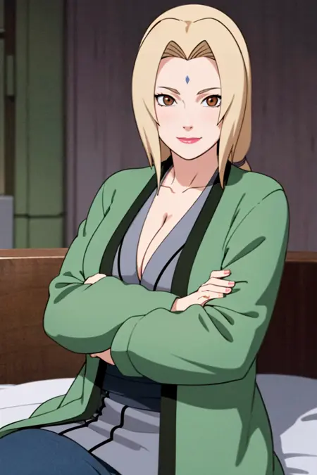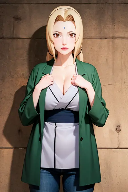 ✦ 主要触发词为 纲手, 金色头发, 大胸部, 成熟女性, 蓝色长裤, 绿色外衣, 胸部绷带。