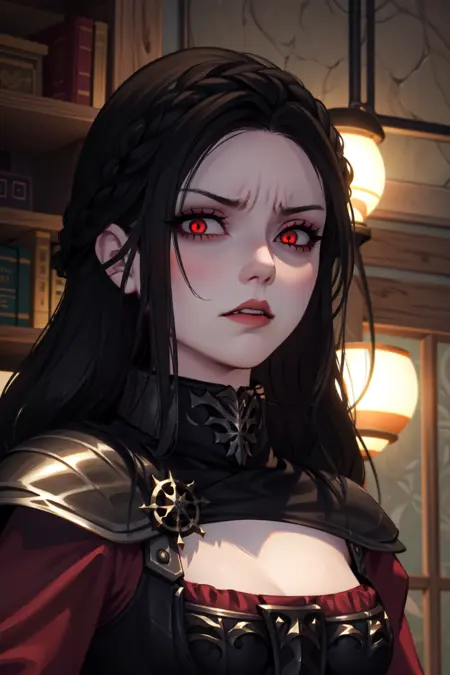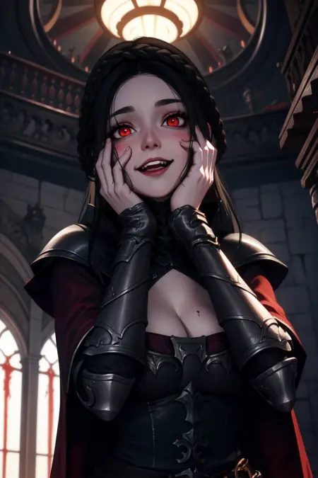 V3: 鎧、マント、赤い袖、胸元の開口部、黒いズボン
