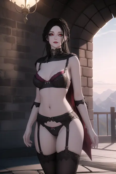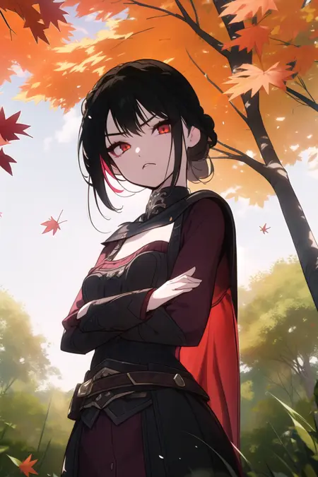 V3: armor, cape, red sleeves, cleavage cutout, black pants