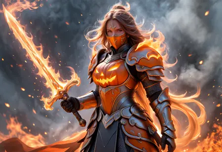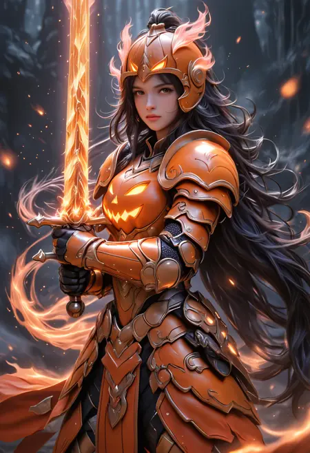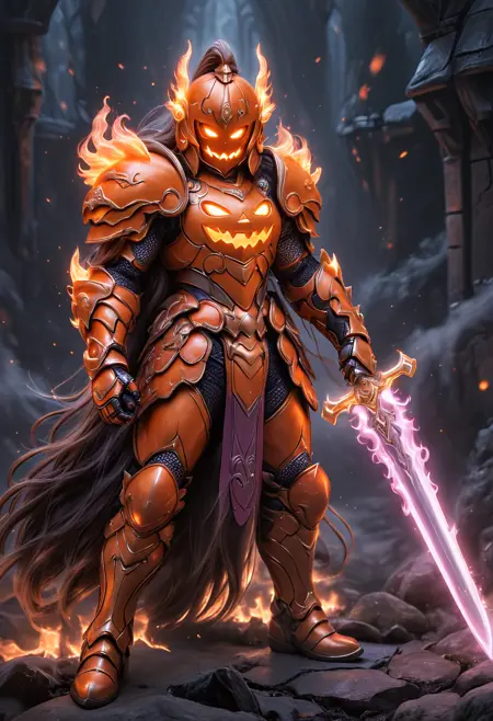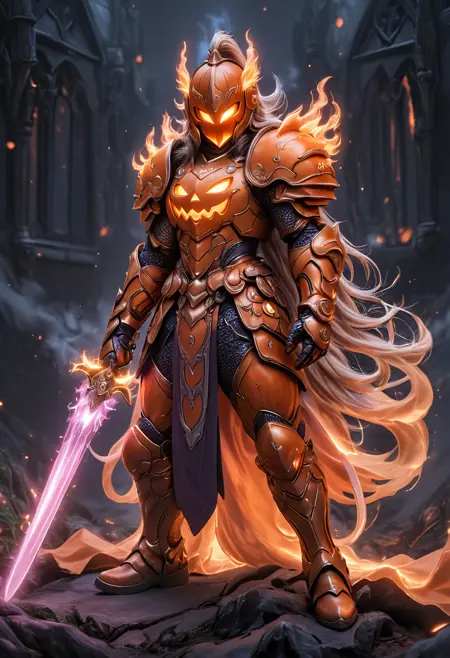 Jackoknight, pumpkin armor, pumpkin helmet, weapon, armor, sword, full armor, long hair, holding weapon, holding sword, glowing, holding, fire, helmet, gauntlets, shoulder armor, very long hair, solo, knight