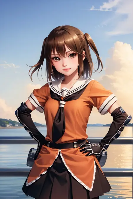 센다이 카이 니: sendai kai ni, two side up, hair ornament, school uniform, serafuku, black neckerchief, black skirt, elbow gloves, fingerless gloves, white scarf