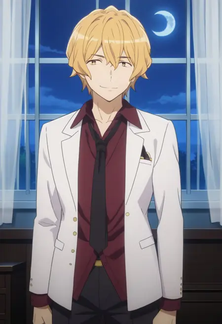 赫尔墨斯,1个男孩,男性焦点,单独,黄眼睛,金发,帽子,棕色头饰,羽毛,帽羽,领结,白色领结,背心,黑色背心,夹克,蓝色夹克,长袖,花边,花边袖子,手套,白色手套,裤子,白色裤子,