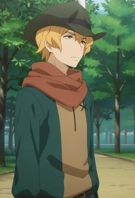 赫尔墨斯,1个男孩,男性焦点,单独,黄眼睛,金发,帽子,绿色头饰,羽毛,帽羽,多色服装,多色衬衫,棕色衬衫,蓝色衬衫,长袖,围巾,红色围巾,手套,棕色手套,腰带,裤子,棕色裤子,靴子,棕色鞋履,