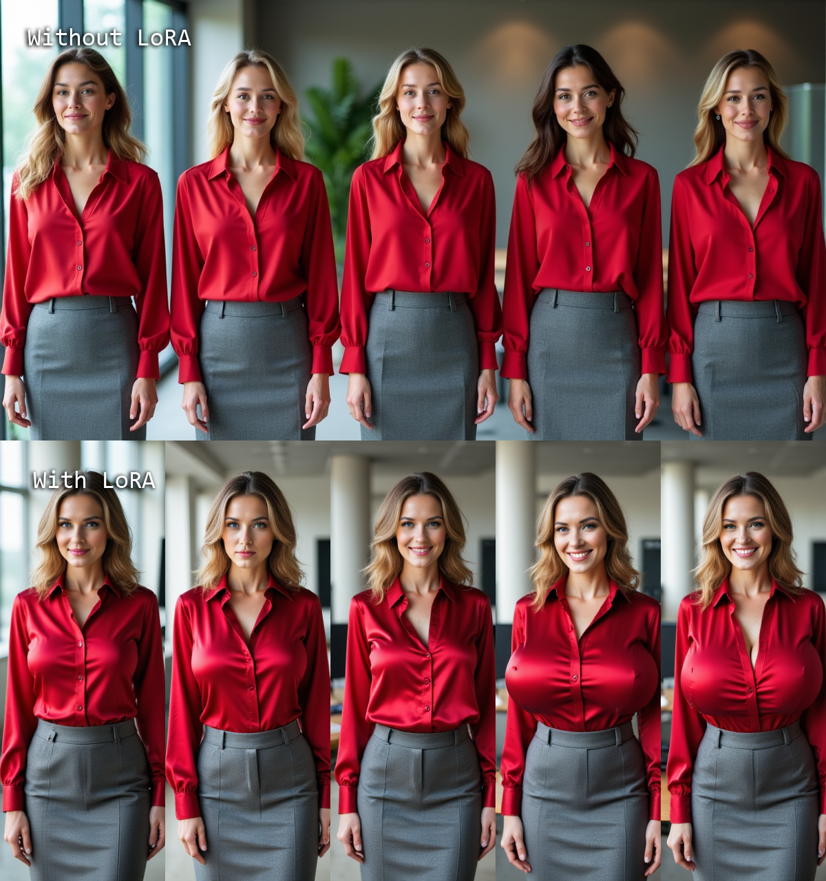 5개의 besequence 패널, 같은 아름다운 여성이 사무실에서 빨간 실크 블라우스와 회색 울 펜실스커트를 입은 사진. 첫 번째 패널에서는 평평한 A컵 유방과 마른 체형, 무표정한 표정을 가지고 있다. 왼쪽에서 오른쪽으로 유방이 점점 더 커진다. 마지막 패널에서는 블라우스가 풀려 있고, 거대한 유방과 깊은 가슴선을 가지며 행복하게 웃고 있다.