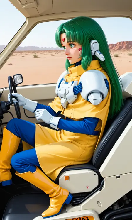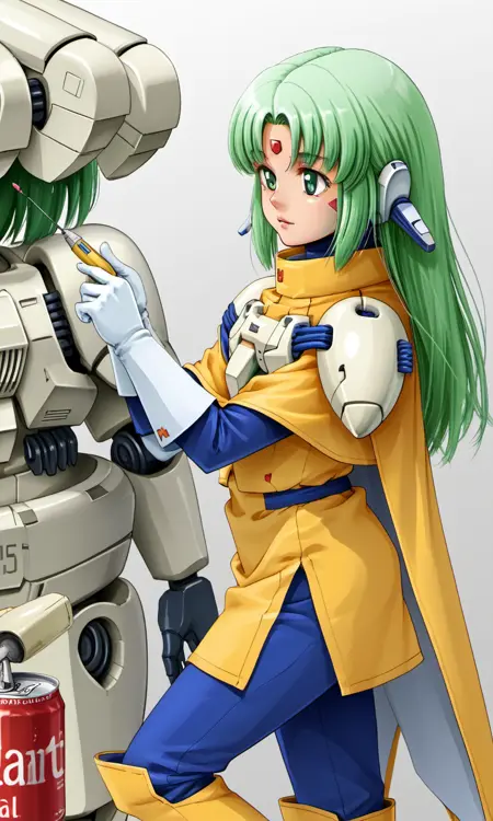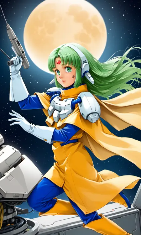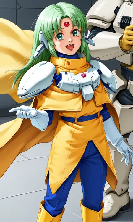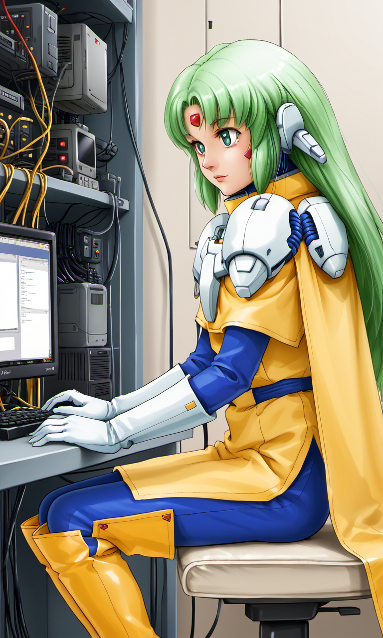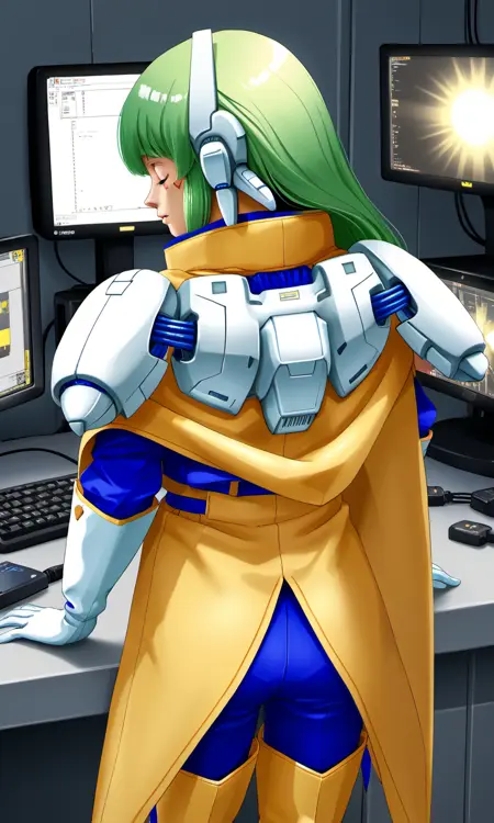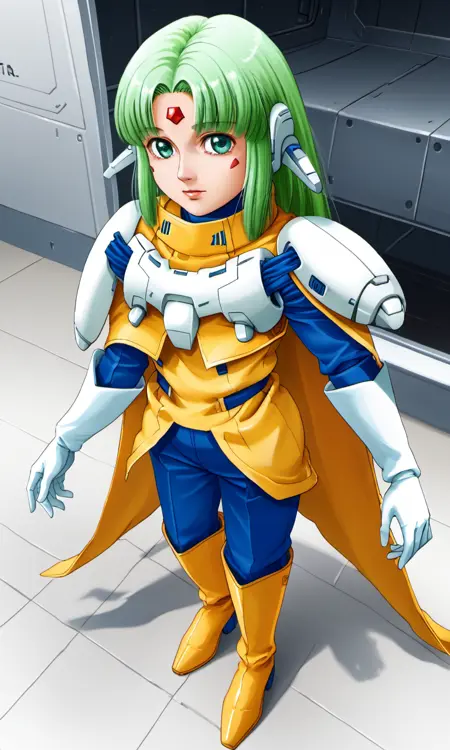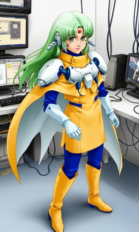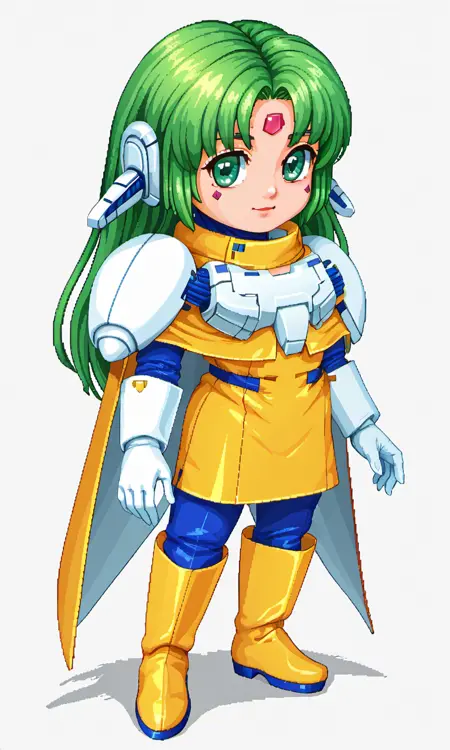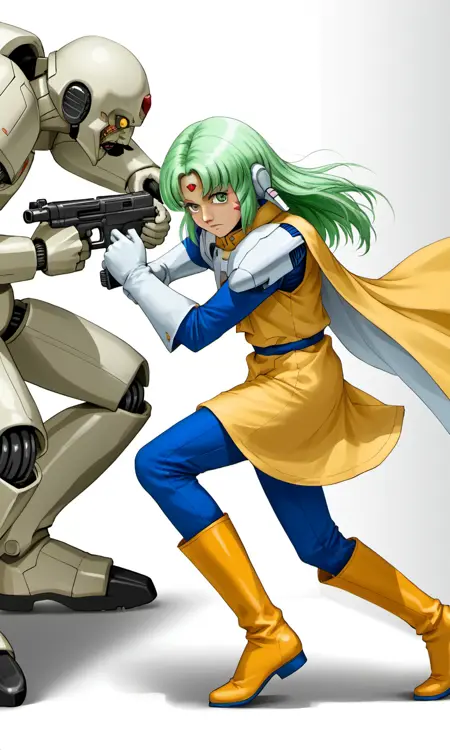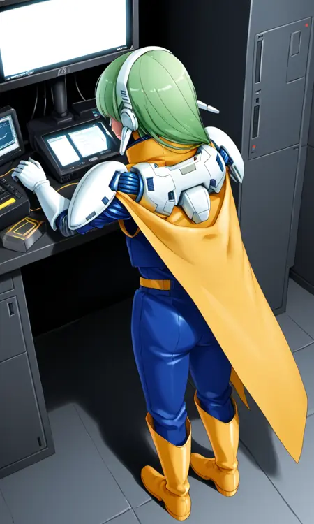robot joints, yellow tunic, white shoulder pads, blue sleeves, white gloves, yellow cape, blue pants, yellow thigh boots,