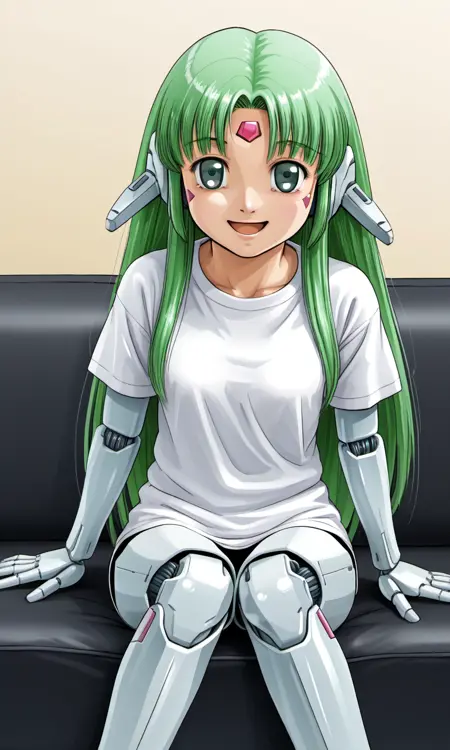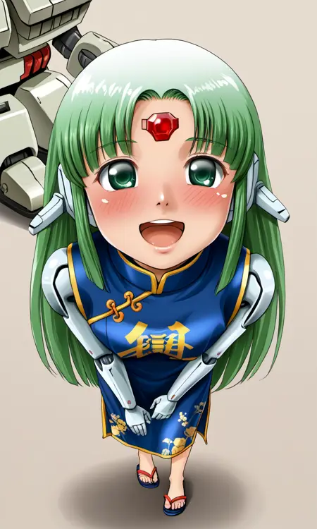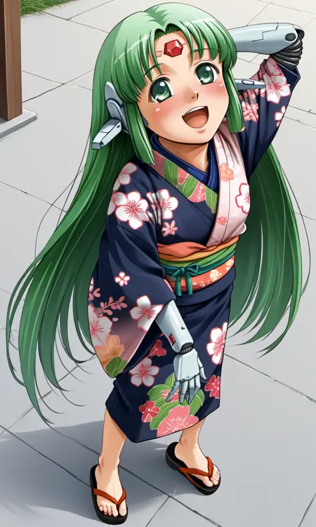 furena, 1girl, gynoid, green eyes, green hair, long hair, robot ears, forehead crystal,