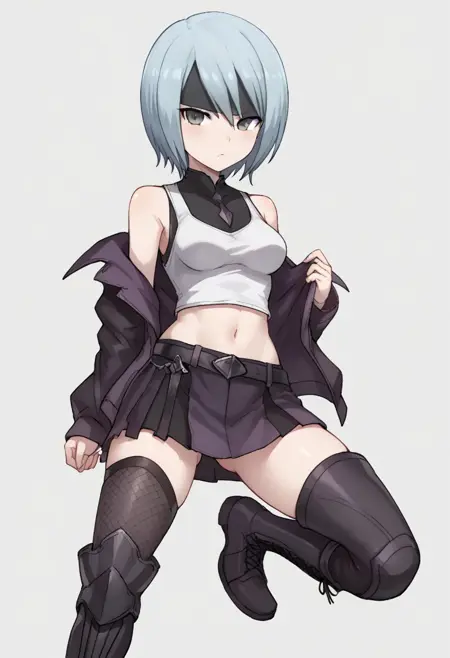 for her usual clothes use the prompt: light blue hair, headband, purple scarf, black armor, black metal gauntlets, pants, boots.