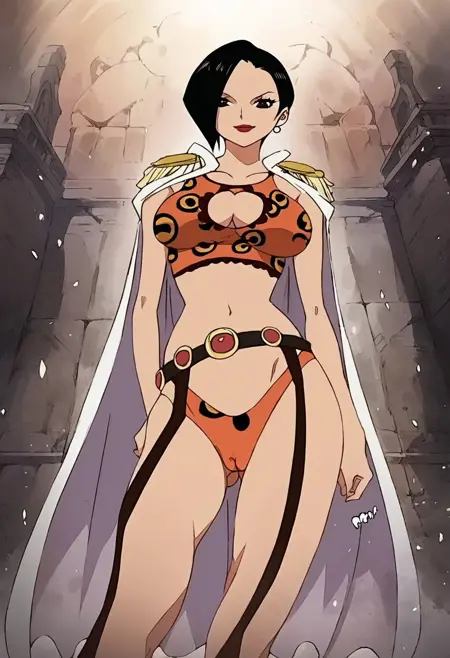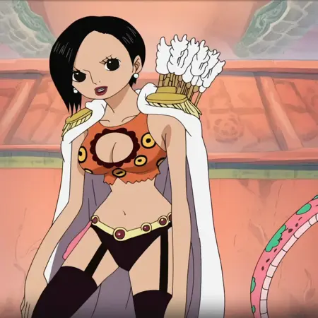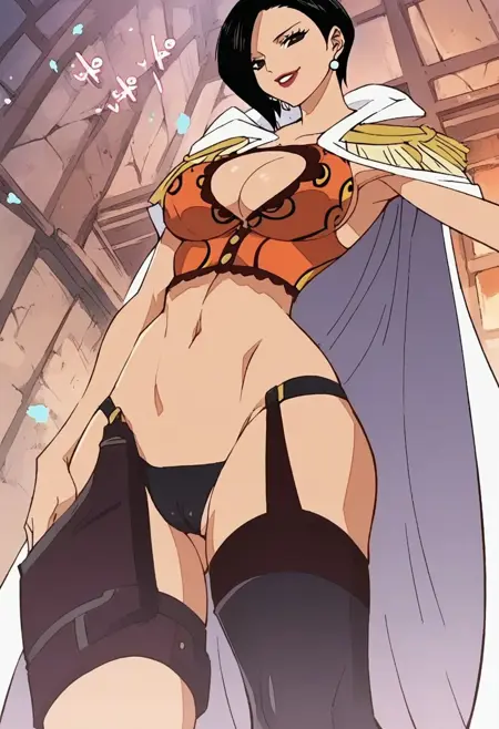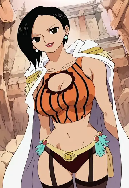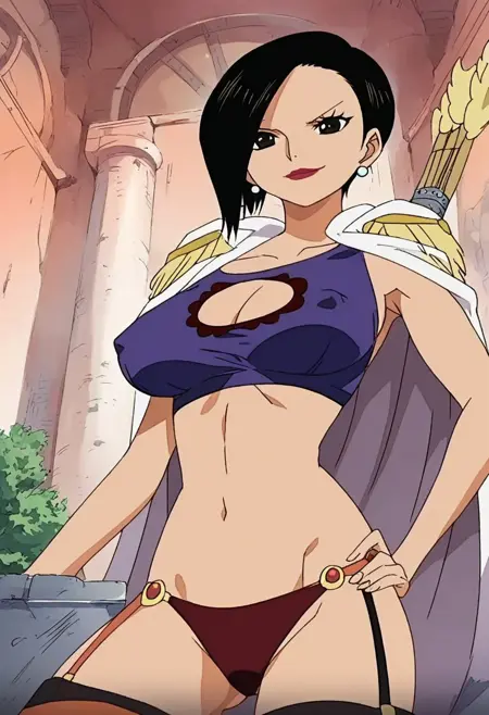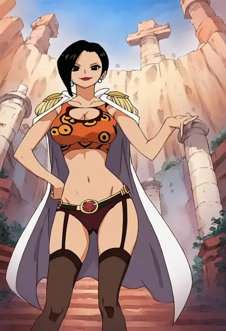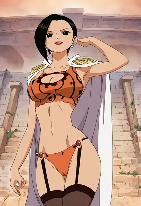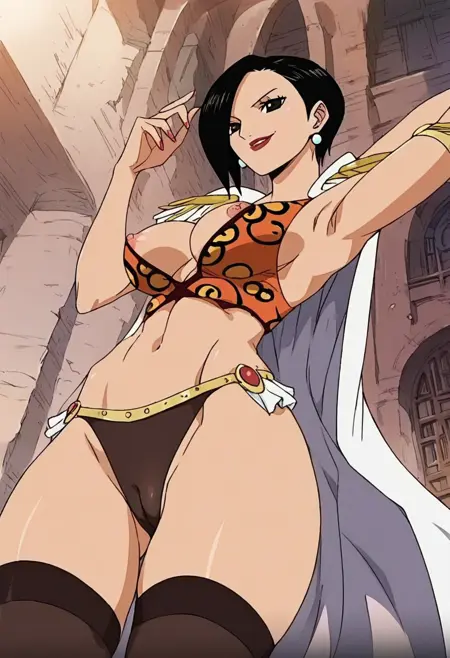 RanOP, 1girl, solo, black hair, short hair, black eyes, lips, lipstick, earrings, pearl earrings, cape, epaulettes, large breast, cleavage, parted on one side hair, long black stockings, panties, straps on stockings, belt, belt ornament, quiver of arrows, snake, jewelry, navel, midriff, groin, boots, cleavage cutout, collarbone,
