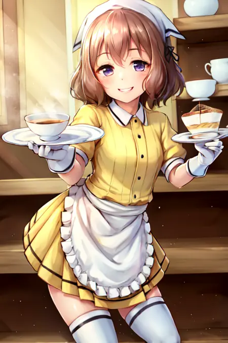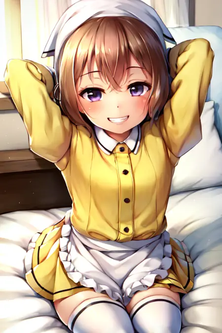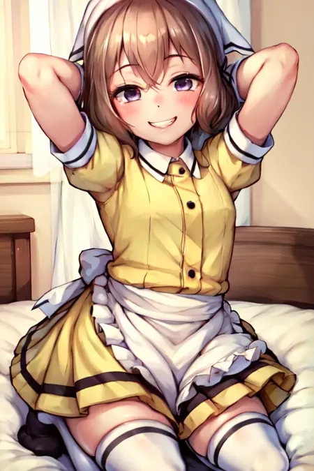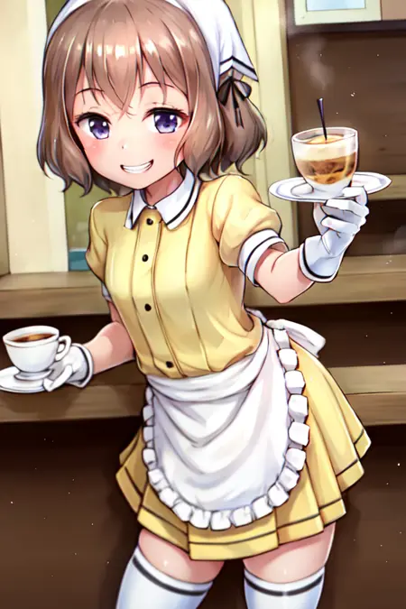 主要服饰:过膝袜、百褶裙、荷叶边、泡泡袖、白色手套、白色过膝袜、绝对领域、黑色丝带、腰围围裙、白色围裙、荷叶边围裙、黄色制服、头巾