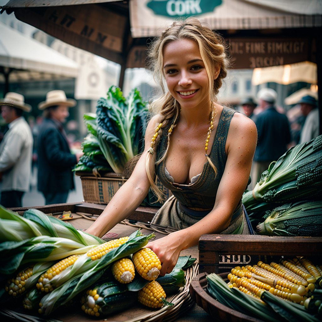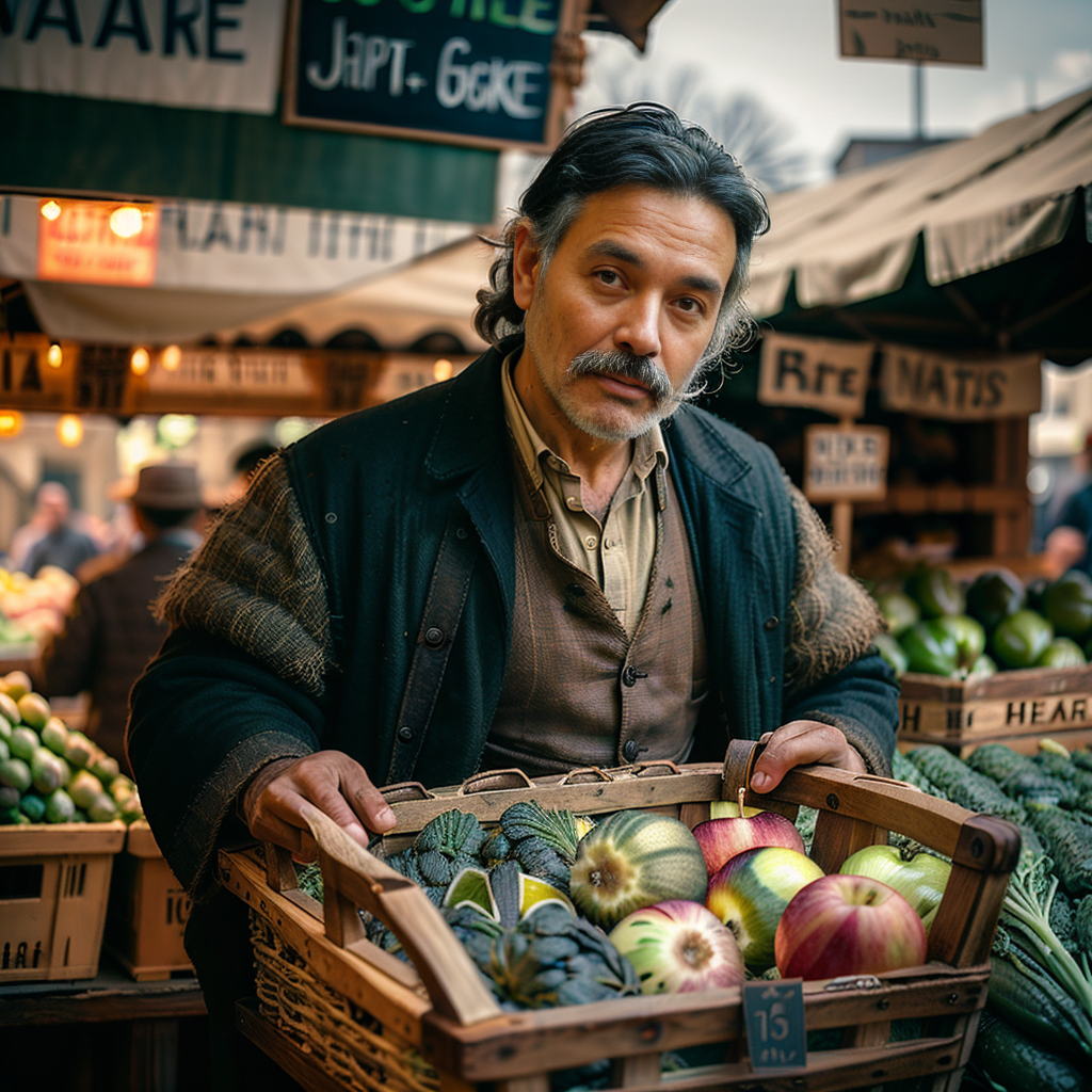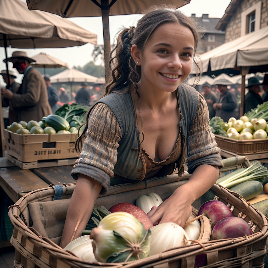 1boy, 1girl, apple, basket, beard, black hair, black headwear, blue eyes, blurry, blurry background, bracelet, braid, bread, breasts, brown eyes, brown hair, brown headwear, brown vest, carrot, cleavage, closed mouth, corn, depth of field, facial hair, fine art parody, food, fruit, grey hair, grin, hat, holding, holding basket, indoors, jewelry, knife, long hair, long sleeves, looking at viewer, male focus, mole, multiple boys, mustache, necktie, old, old man, old woman, onion, outdoors, potato, radish, realistic, robe, salad, scarf, shirt, short hair, single braid, smile, solo, solo focus, stubble, teeth, upper body, vegetable, vendor (grocer), vest, watermark, white hair