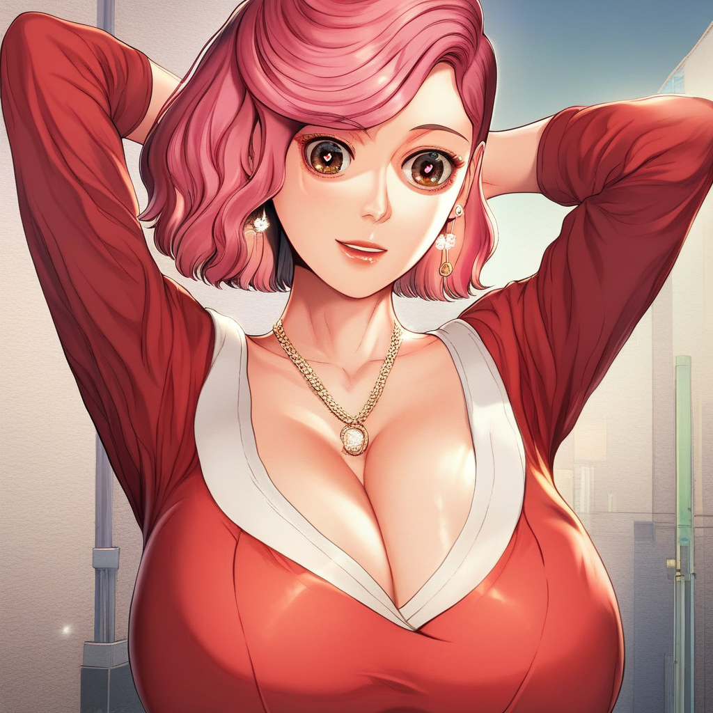 김지희: kim_ji-he, 선명한 갈색 눈, 아름다운 진한 분홍색 머리, 아름다운 미디엄 밥컷, 앞머리, 크고 헐렁한 가슴,