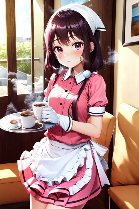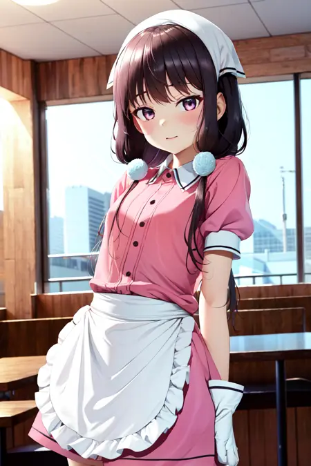 主要服装:荷叶边、白色手套、粉色制服、蓬松短袖、腰围裙、白色围裙、粉色衬衫、荷叶边围裙、头巾