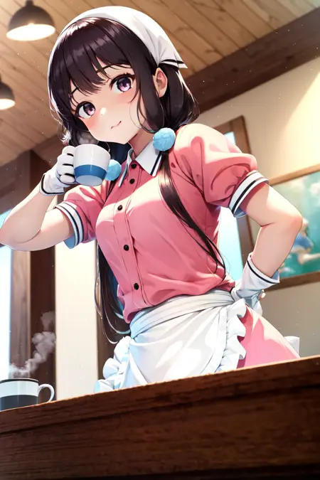 Main clothes: frills, white gloves, pink uniform, puffy short sleeves, waist apron, white apron, pink shirt, frilled apron, head scarf