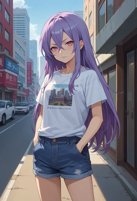 TakamatsuShiera, pink eyes, purple hair, long hair, hair between eyes