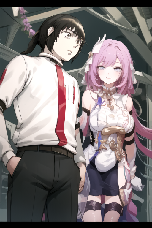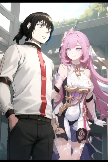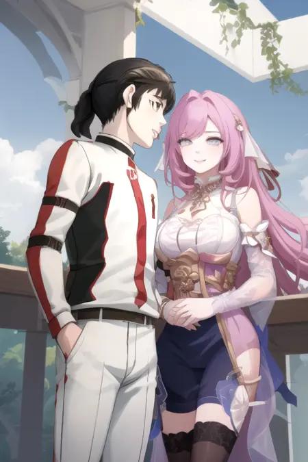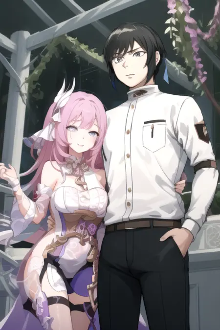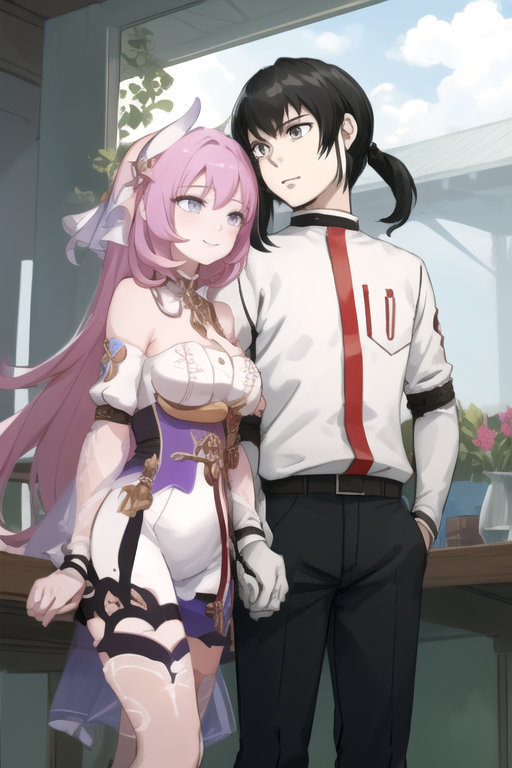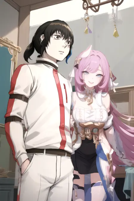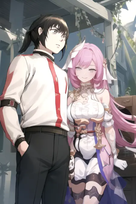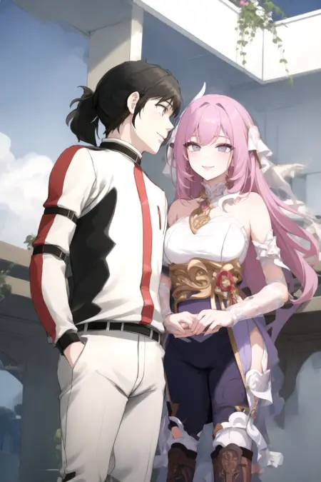 BamElysia, 1boy, 1girl, hetero, standing, smile, cowboy shot
