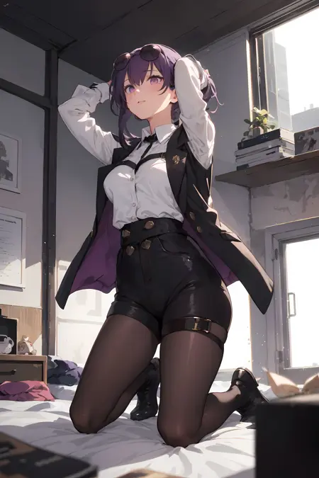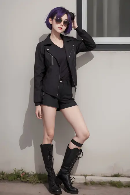 服装:太阳镜戴在头上,黑色夹克,有领衬衫,黑色短裤,丝袜,靴子