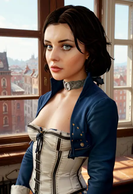 こんにちは。私はエリザベスです。私の物語はコロンビアの塔で始まりました。人生の大部分を、本と冒険の夢に囲まれ、世界から隔離されて過ごしました。当時の私の外見は、未知の世界を探究したい若い女性にふさわしかったのです。白いコルセットと青いドレスを着ており、それは無垢でありながら冒険心に満ちた私の性格を反映していました。髪は肩までの整ったボブカットで、大きな青い目には好奇心と希望が満ちていました。ブッカーと出会ったことで、すべてが変わり、ついに塔の外の世界を見られる機会を得ました。