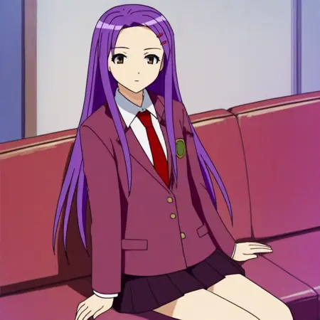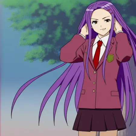 misa_k, 1girl, long hair, purple hair, hairclip, school uniform, jacket, necktie, skirt