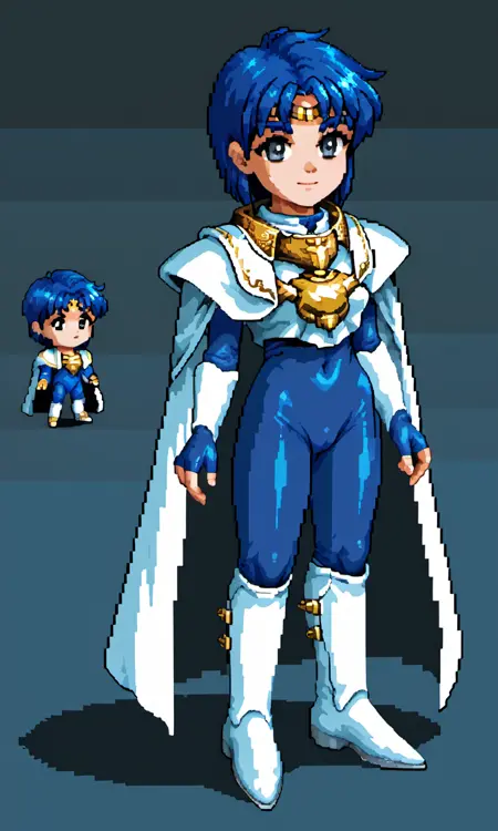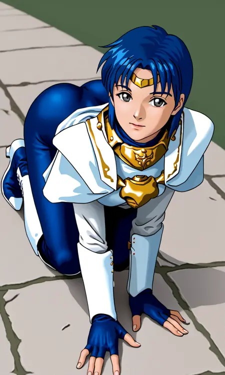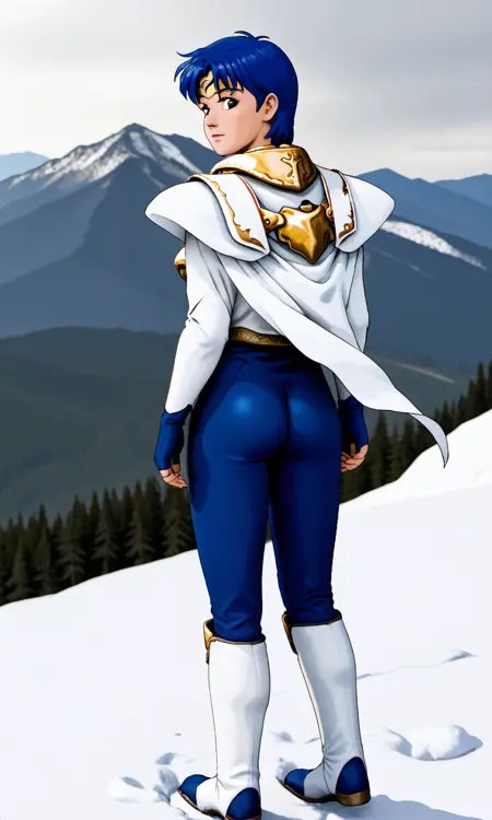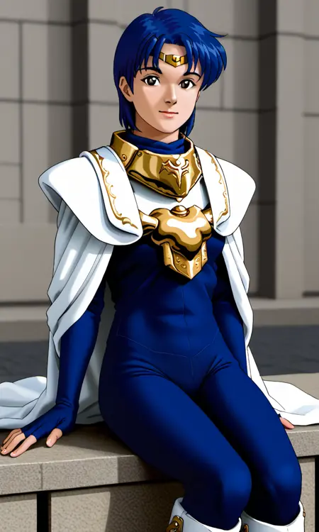blue bodysuit, breastplate, fingerless elbow gloves, white mantle, boots
