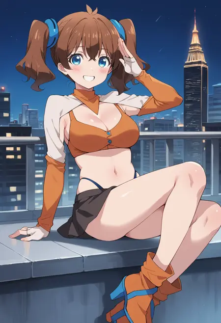 mizuharamahiru, twintails, brown hair, medium hair, hair ornament, ahoge, hair between eyes, blue eyes, large breasts,