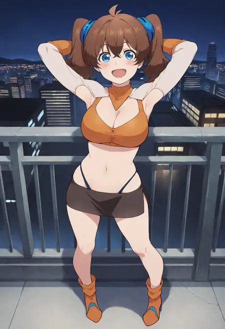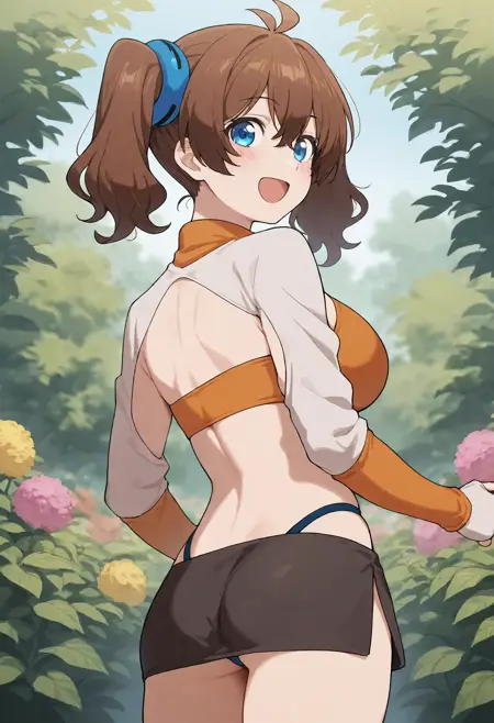 mizuharamahiru, twintails, brown hair, medium hair, hair ornament, ahoge, hair between eyes, blue eyes, large breasts,
