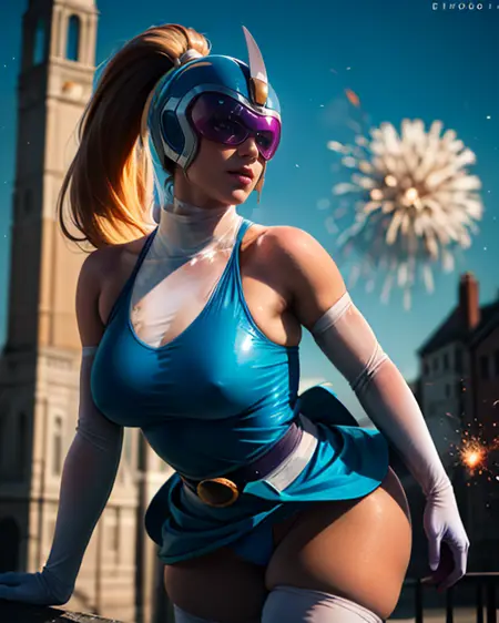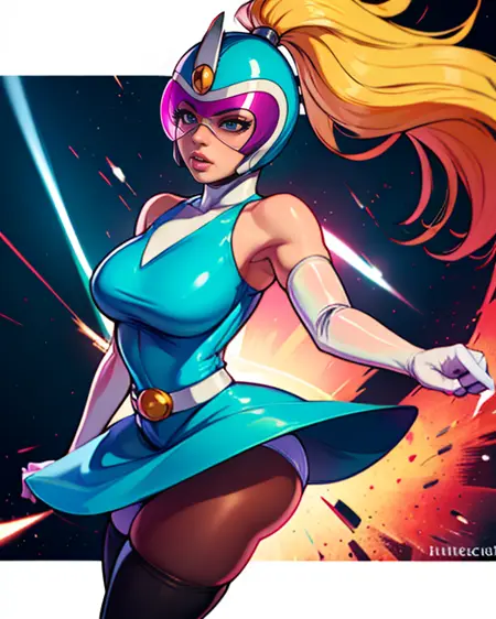 SSilv, white elbow gloves, belt ,blue dress with skirt, white thighhighs ,helmet with pink visor, lipstick, blue panties,