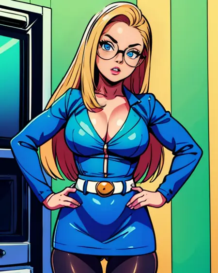 No TW for casual - to prompt - Silvia, long hair, glasses, belt, blue jacket, pantyhose, black heels, white buttons,