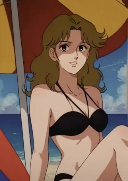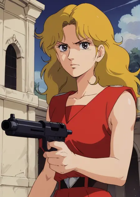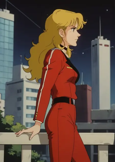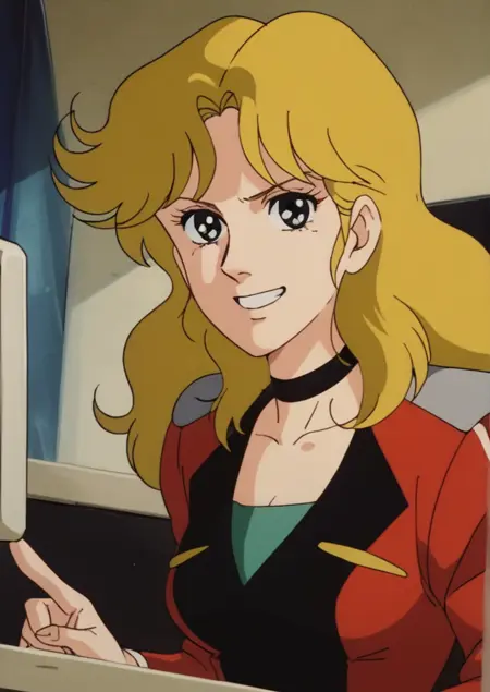 提示词如:Remy,长发,金发,深色眼睛,黑色项圈,严肃表情,红黑套装,绿色T恤,手叉腰,上半身,户外,花园背景