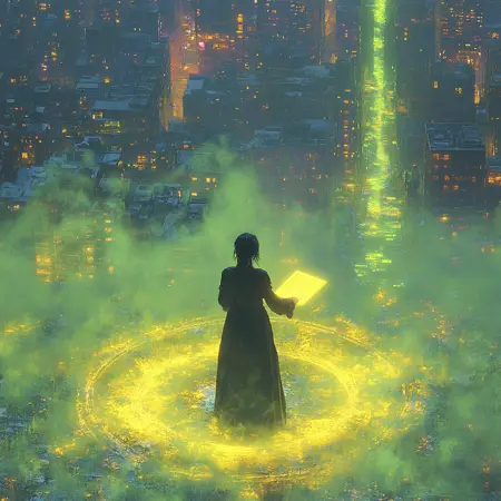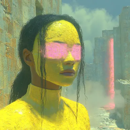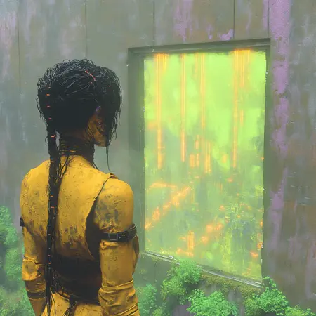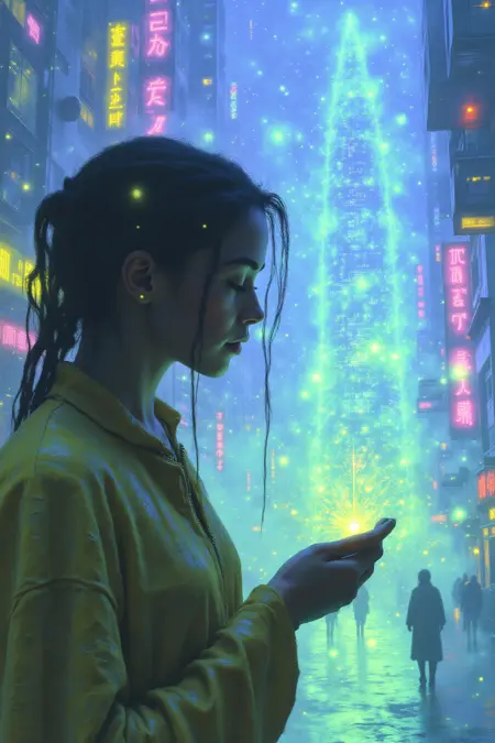 - 이미지는 빛나는 네온 요소, 부드러운 퍼짐 조명, 신비로운 분위기로 가득 찬 하이테크 꿈의 풍경으로 변화합니다. 인물의 합성 강화 요소가 강조되고, 안개 낀 미래적 분위기로 장면의 깊이가 더해져 독특한 사이버-드림 느낌을 완성합니다.