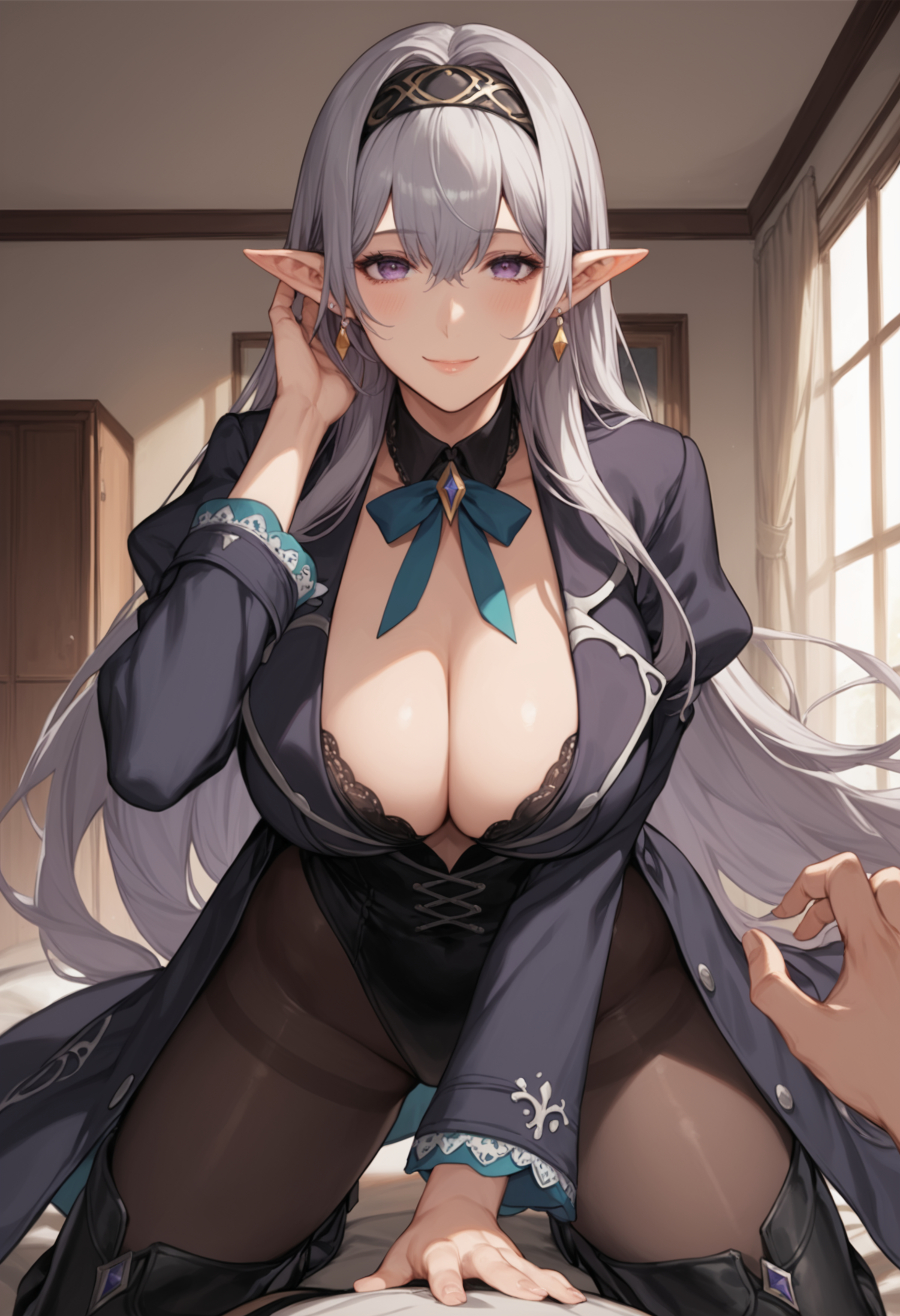 태그 권장사항: 1girl, pointy ears, solo, large breasts, thighhighs, purple eyes, very long hair, earrings, jewelry, black thighhighs, grey hair, hairband, coat, black leotard, cleavage, thigh boots, pantyhose,