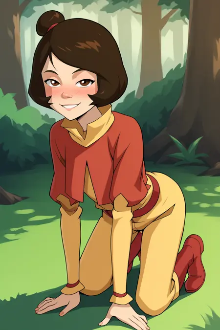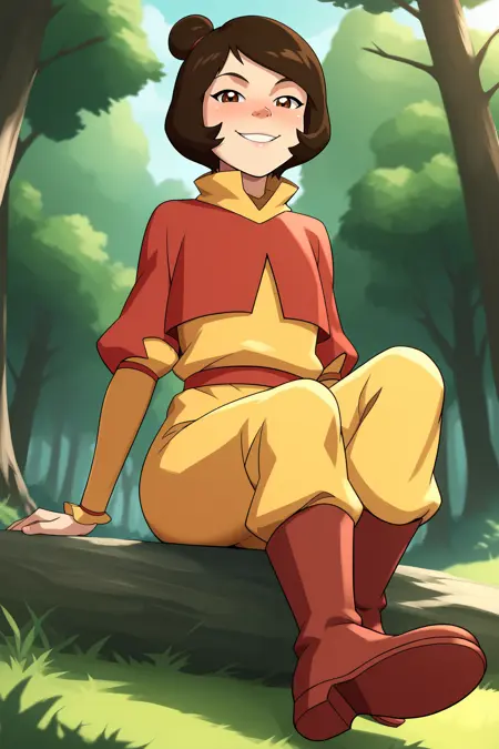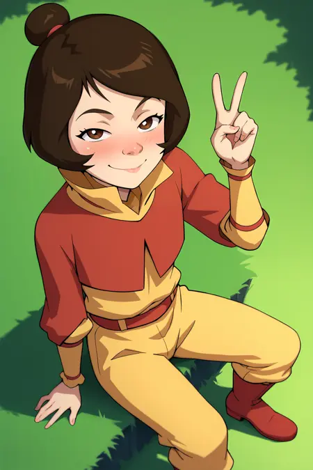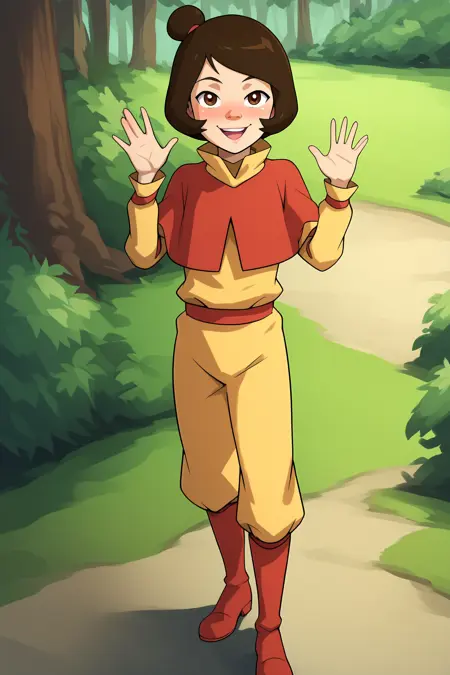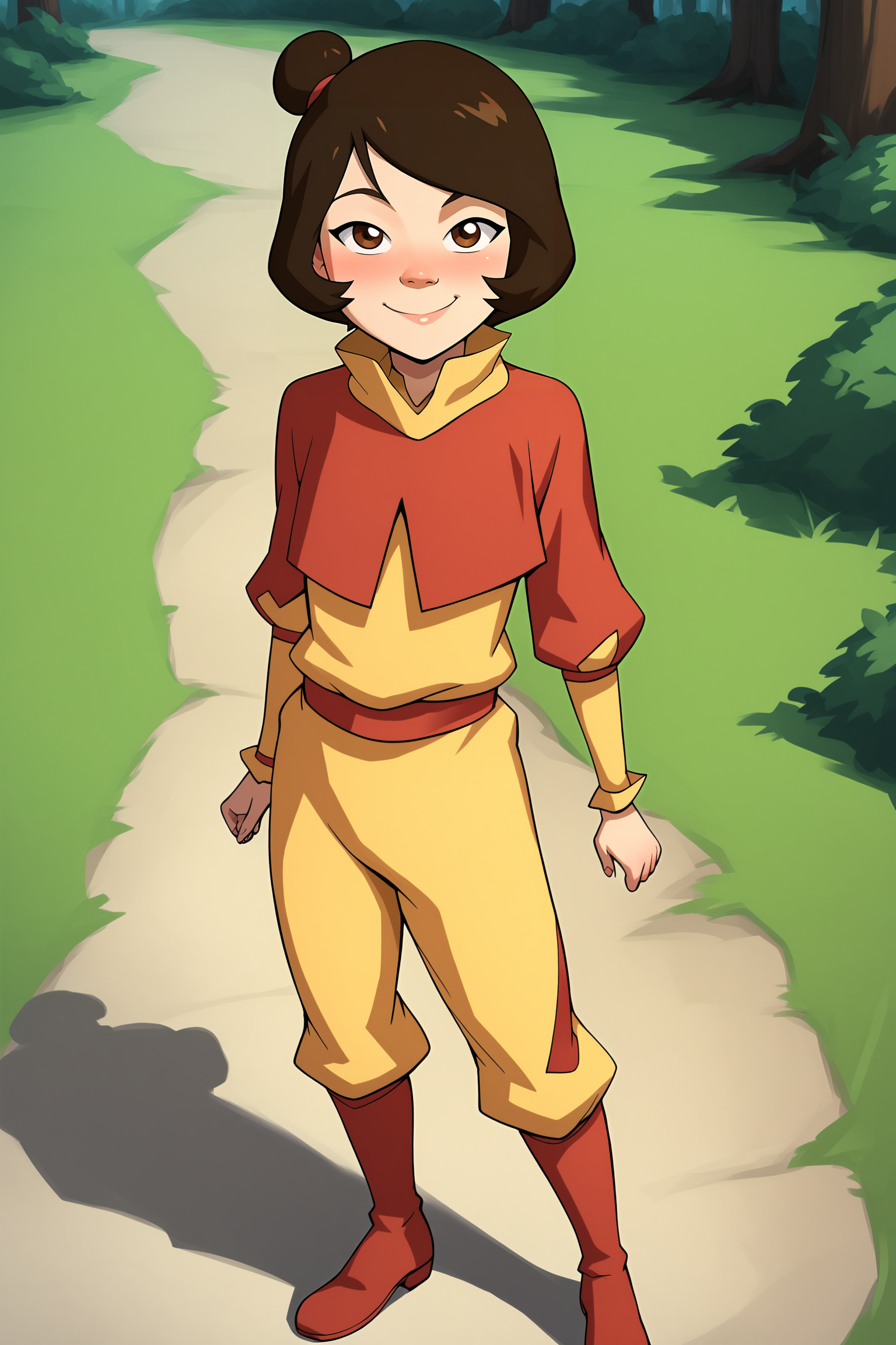 ➜ JinoraAvatarPXL, 1girl, brown eyes, brown hair, short hair, single hair bun, flat chest, red capelet, yellow shirt, long sleeves, red belt, yellow pants, red boots