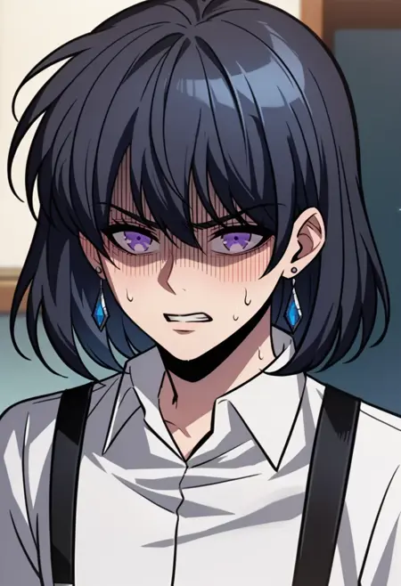 catio, purple eyes, black hair, medium hair, earrings,