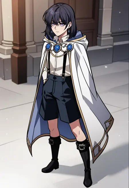 white shirt, suspenders, blue shorts,