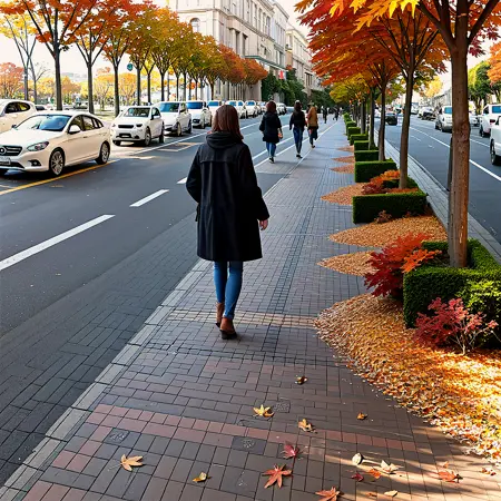 scenery, road, motor vehicle, autumn, street, pavement, day, autumn leaves, building