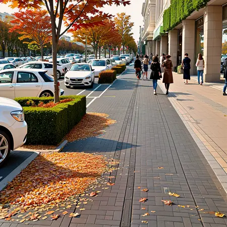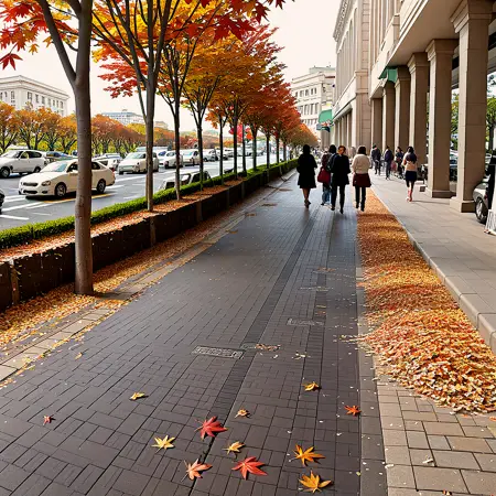 building, no humans, sidewalk, outdoors, pavement, street, car, day, autumn leaves