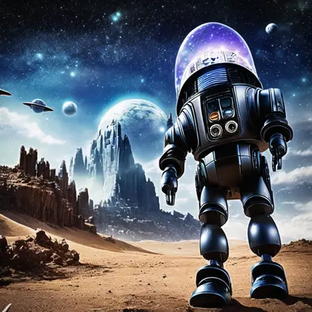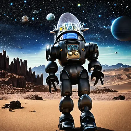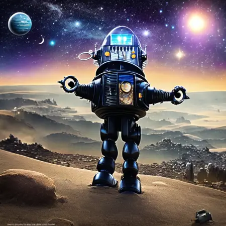 これは『Forbidden Planet』に登場するロビー・ザ・ロボットで、ロバート・キノシタが多数のゲスト出演を務めています。まだ少々完成段階ではありませんし、彼の複製が多数出力されることがあります。この部分を正確に排除する方法はまだ明確ではありませんが、画像2画像やControlNetを1つのキャラクターに使用すれば、より正確になると思います。